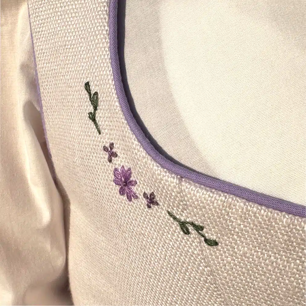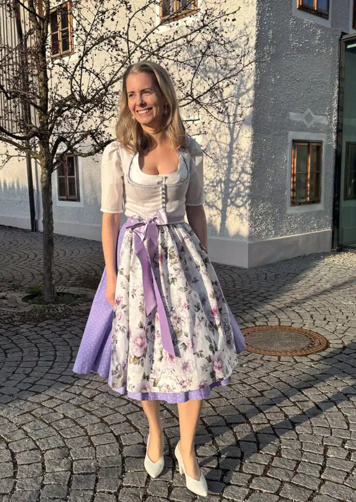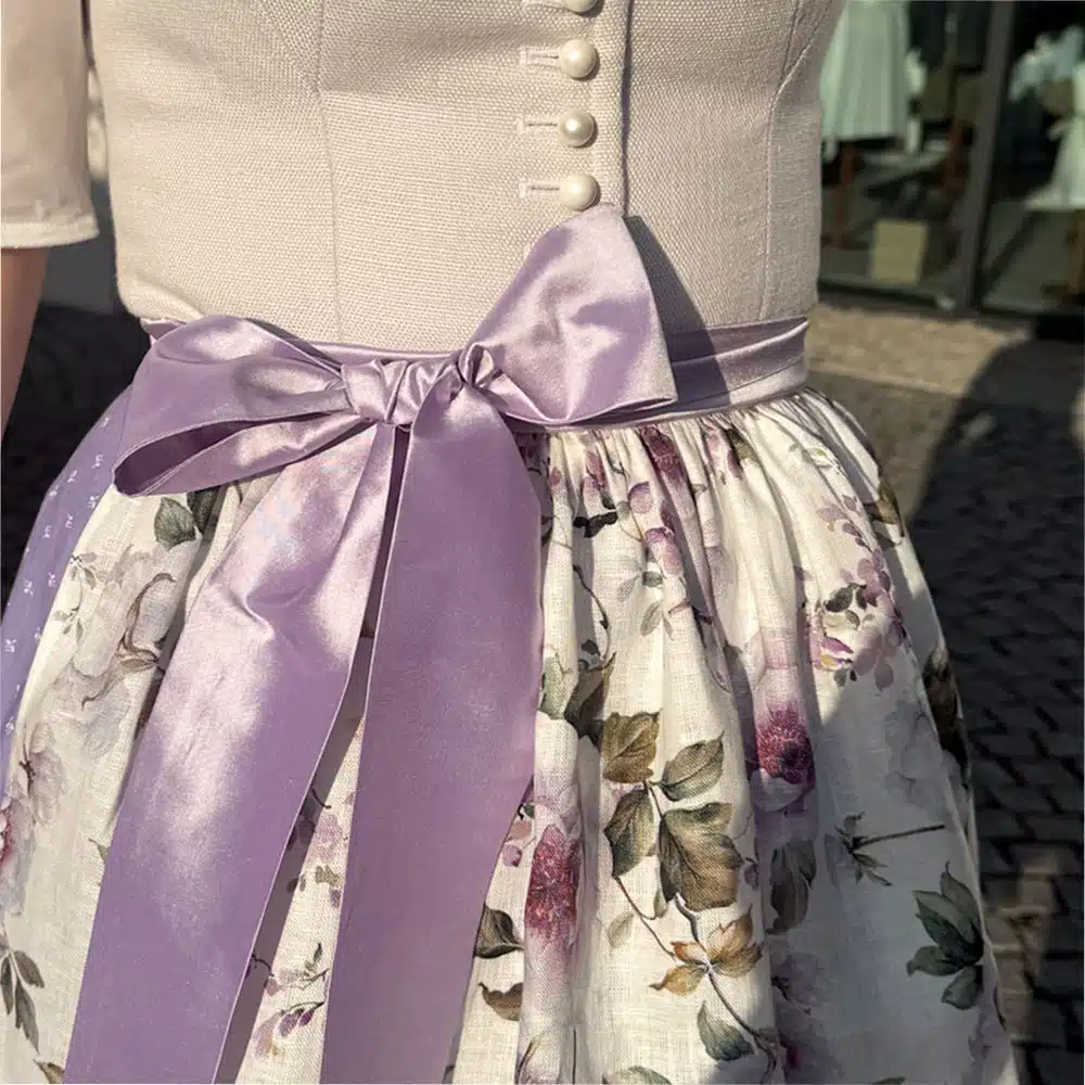 Die fliederfarbenen Akzente am Oberteil bringen dann die eigentliche Frühlingsstimmung ins Spiel. Flieder gehört heuer zu den schönsten Farben der Saison und macht das Kleid weich, lebendig und leicht. Dazu kommt eine Leinenschürze mit floralem Druck und ein Schürzenband aus schimmernder Wildseide. Die Flieder- und Grüntöne der Schürze finden sich in der Handstickerei am Dekolleté wieder. Genau solche kleinen handwerklichen Details machen für mich den Unterschied.
