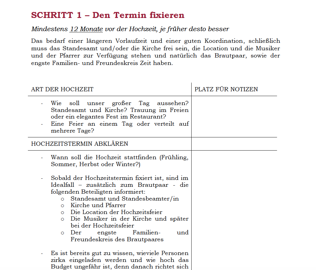 Vor Ihnen liegt unsere ultimative Hochzeitscheckliste, die Sie beim Planen Ihrer Hochzeit maßgeblich unterstützen wird. Sie wurde von Hochzeitsexperten lange Zeit erarbeitet, überarbeitet und verbessert und basiert auf den Erfahrungen und Tipps von zahlreichen Hochzeitspaaren, die ihren schönsten Tag bereits hinter sich haben.