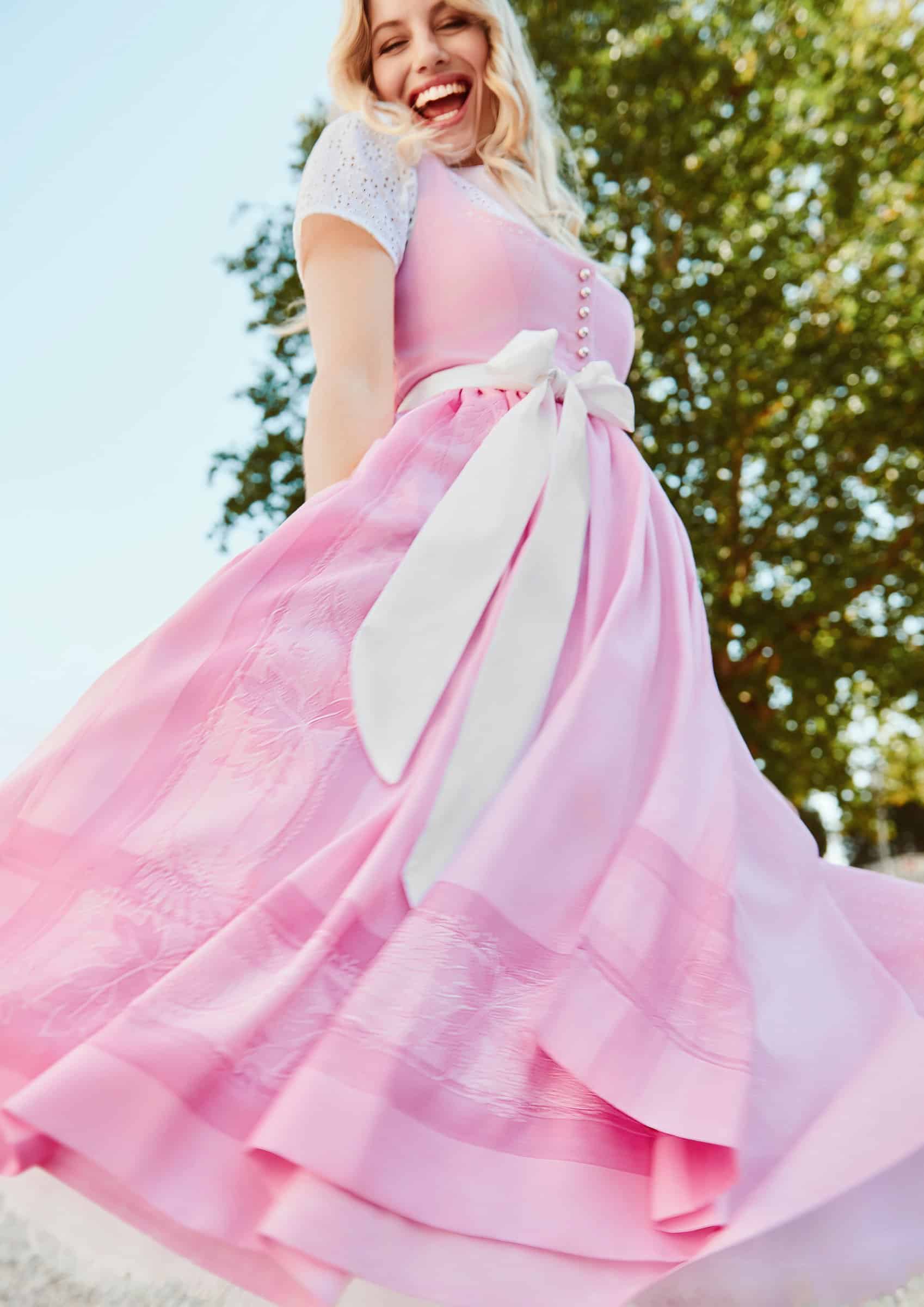 Die weiße Kurzjacke aus Leinen mit hellblauen Details (im Bild rechts) ergänzt die Kollektion um eine sportiv-leichte Variante. Sie lässt sich sowohl zum Dirndl als auch zur Jeans tragen und fügt sich harmonisch in die ruhige, zeitlose Bildwelt ein.
