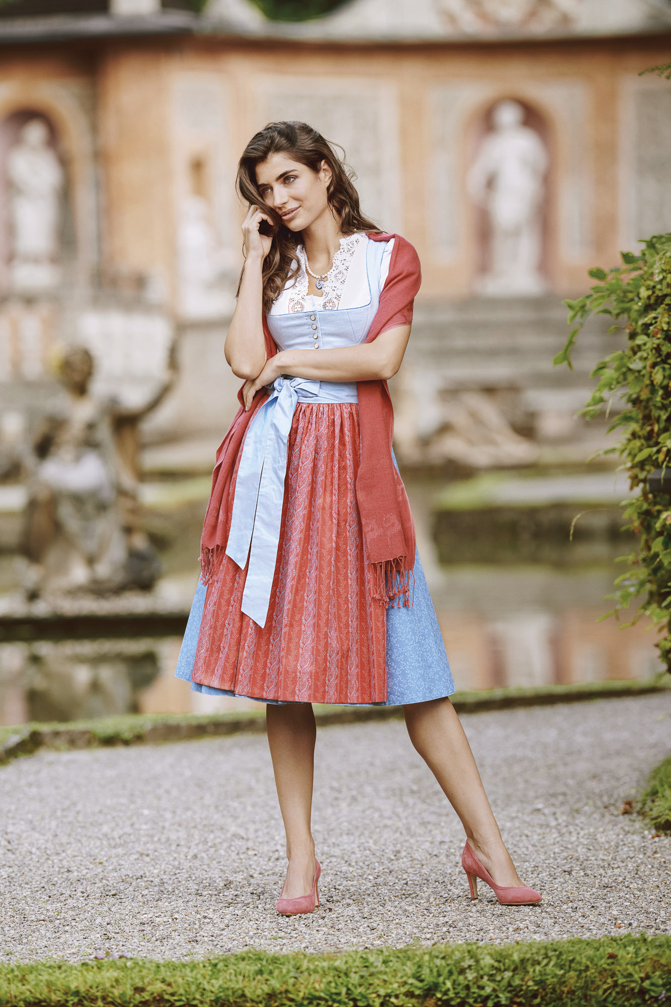 Trägt die Braut ein festliches Hochzeitsdirndl in einem Pastellton mit zB einer weißen Schürze, so trägt man als Gast entweder ein Seidendirndl in einem kräftigeren Farbton und gedeckten Tönen oder überhaupt – und damit kann man nichts falsch machen – ein klassisches Leinendirndl mit einer Seidenschürze oder einer Baumwollschürze mit einem Seidenband.