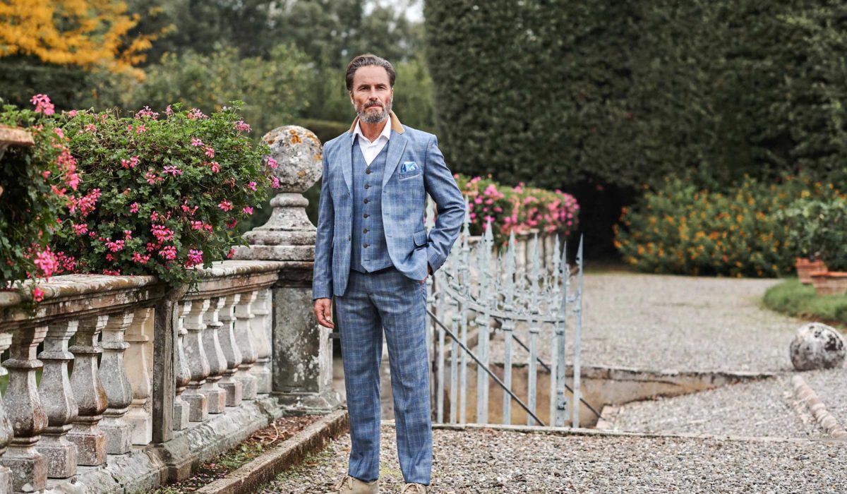 Elegantes Herrensakko mit Facon, dazu passend eine Weste mit V-Ausschnitt. Kombiniert mit einer hellen Hirschledernen.